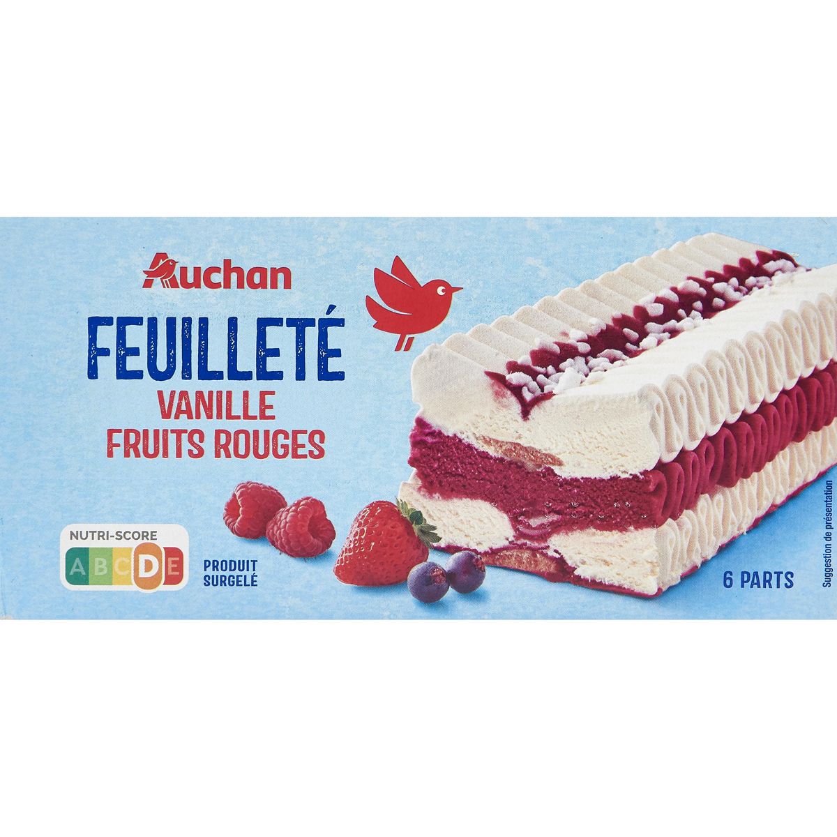 Ingrédients : Eau, lait écrémé réhydraté (origine UE), sucre, sirop de glucose, graisse végétale de noix de coco, purée de framboise 4,5%, purée de fraise 3,9%, purées de cassis 3,5%, lactose (lait origine UE ou hors UE) et protéines de lait (origine UE ou hors UE), sucre glace, huile de tournesol, dextrose, farine de blé, lait écrémé en poudre (origine UE ou hors UE), beurre (lait origine UE) émulsifiants : mono- et diglycérides d'acides gras, lécithines (soja), polyricinoléate de polyglycérol gélifiants : farine de graines de caroube, gomme guar, gomme xanthane, pectines, gomme Tara meringue 0,4% (sucre, amidon de blé, blanc d'œuf en poudre), beurre de cacao 0,1%, sirop de sucre inverti, jus concentré de sureau, extrait de vanille, concentré de betterave rouge, arôme naturel de cassis, arôme naturel de framboise, jus de cassis à base de concentré 0,1%, matière grasse laitière anhydre (lait origine UE ou hors UE), jus concentré de citron jaune, arôme naturel de fraise, arôme naturel de vanille, protéines de pois hydrolysées, concentré de carotte, œuf entier en poudre, sel poudres à lever : diphosphates, carbonates de sodium cannelle en poudre.Traces éventuelles d'autres céréales contenant du gluten (avoine, orge), d’arachides et de fruits à coques.