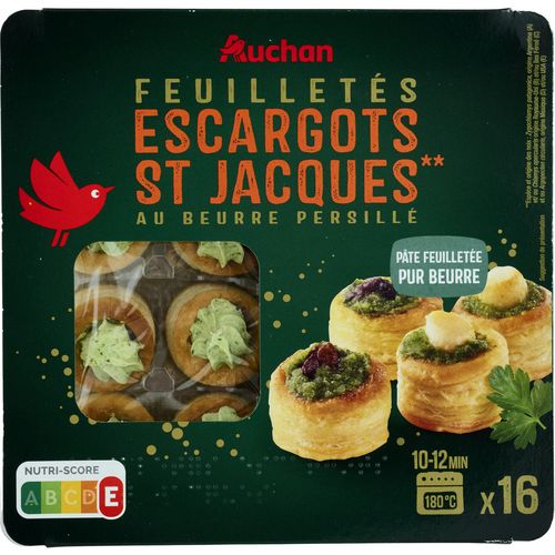 Ingrédients : Pâte feuilletée 52,9% (farine de BLÉ, beurre concentré 14,8% (LAIT) , eau, sel, ŒUF, poudre à lever : carbonates de sodium), beurre 19,8% (LAIT), noix de Saint Jacques** 9,4% (MOLLUSQUE), chairs d'escargots 9,4% (MOLLUSQUE) ( Helix (lucorum, pomatia, aspersa ), ail 4,6% , persil 2,8%, fécule de manioc, sel, épices, plantes aromatiques (contient CÉLERI). * Espèce et origine des noix : Zygochlamys patagonica , origine Argentine (A) et/ ou Chlamys opercularis origine Royaume-Uni (B) et/ou îles Féroé (C) et ou Argopecten circularis , origine Mexique (D) et/ou USA (E) : voir lettres près du numéro de lot Pourcentages exprimés sur le total de la recette. Elaboré à partir de lait origine UE ou hors UE