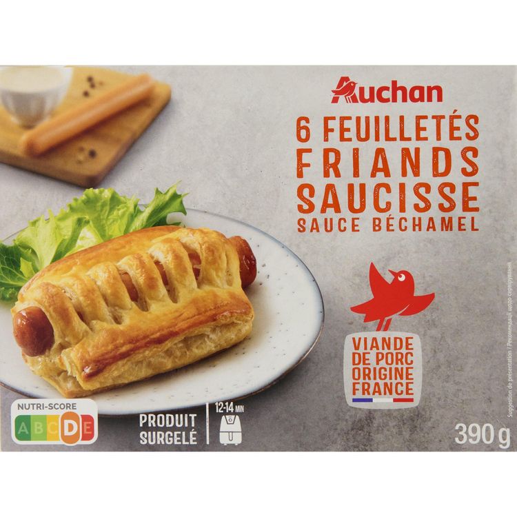 Pâte feuilletée garnie d'une préparation à base de saucisse de Strasbourg et d'une sauce béchamel, à cuire, surgelée