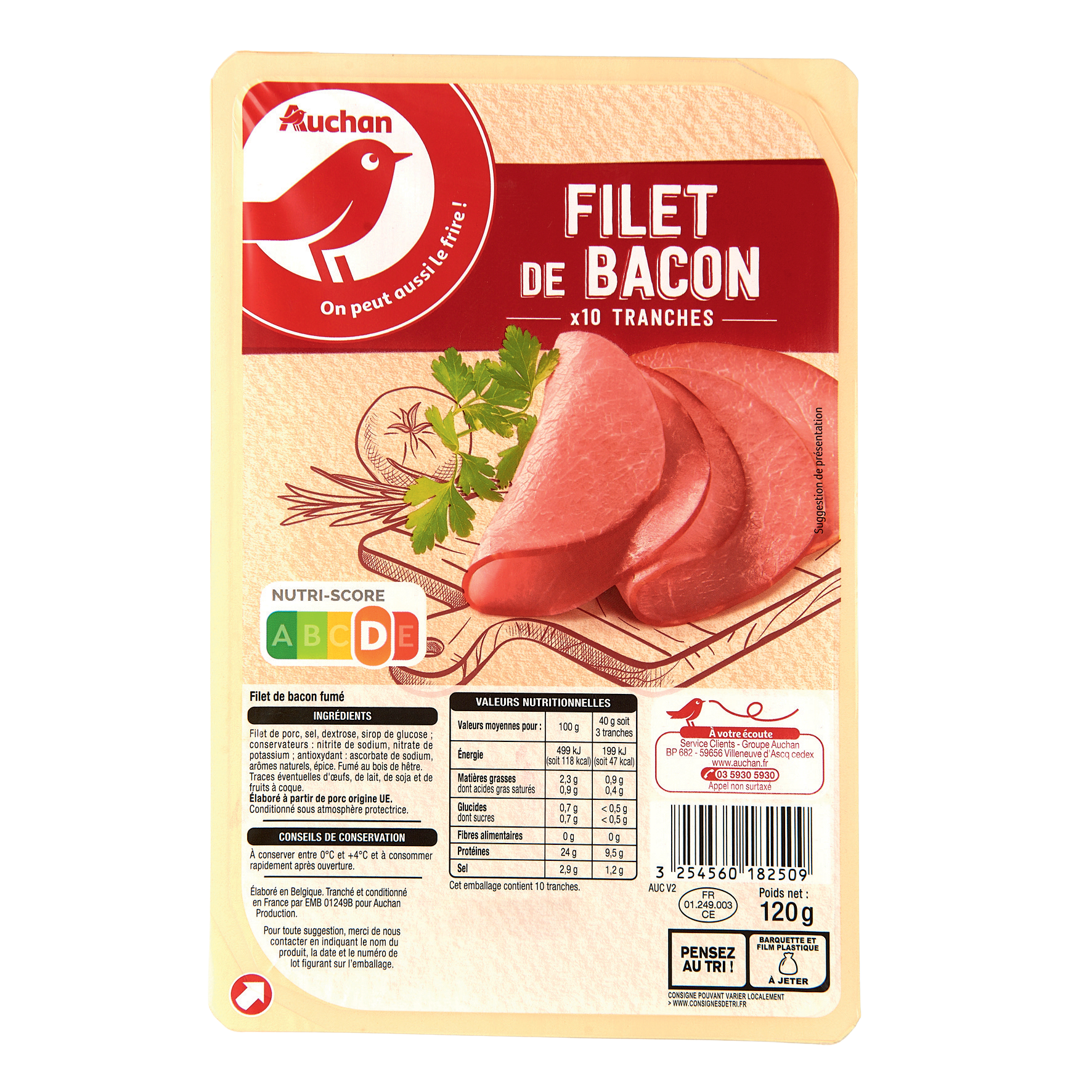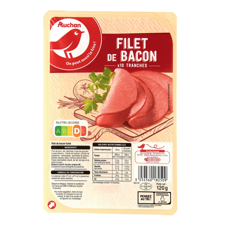 Ingrédients : Filet de porc, sel, dextrose, sirop de glucose conservateurs : nitrite de sodium, nitrate de potassium antioxydant : ascorbate de sodium, arômes naturels, épice. Fumé au bois de hêtre Elaboré à partir de porc origine UE Traces éventuelles d'oeufs, de lait, de soja et de fruits à coque.