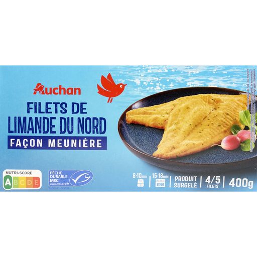 Ingrédients : Filet de limande du Nord MSC (POISSON) ( Limanda Aspera ) 75 %, farine de BLÉ, huiles végétales (colza et tournesol en proportion variable), eau, amidon modifié de maïs, gluten de BLÉ, semoule de BLÉ, jus concentré de citron 0.6%, sel, farine de maïs, persil déshydraté 0,08%, dextrose, amidon de manioc, épices. Traces éventuelles de mollusques, lait, oeuf, céleri et soja. *Malgré tout le soin apporté à la préparation de nos produits, la présence exceptionnelle d'arêtes n'est jamais exclue. **Ce produit provient d'une pêcherie qui a répondu au référentiel environnemental du MSC pour une pêche durable et bien gérée. www.msc.org/fr