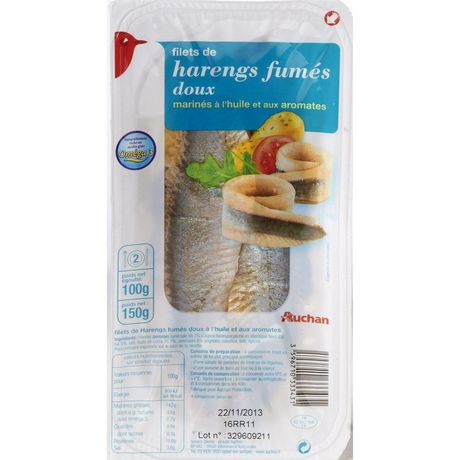 Ingrédients : Hareng (poisson) fumé salé 66,7% (Clupea harengus pêché en atlantique Nord-Est 64,3%, sel), huile de colza 26,7%, aromates 6% (oignons, carottes, eau, vinaigre, sel), épices. Pourcentages exprimés sur le total de la recette.