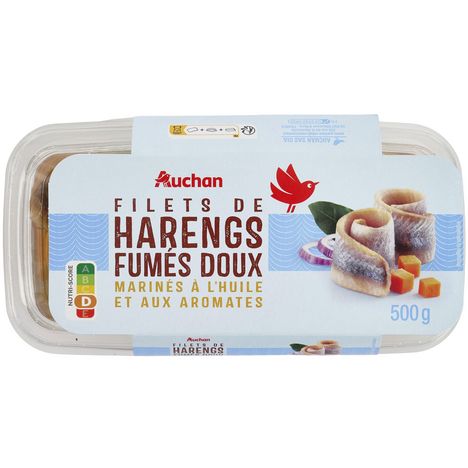 Ingrédients : Hareng fumé 60% (Hareng (POISSON) : Clupea harengus pêché en atlantique Nord-Est 57,8%, sel), huile de colza 37%, aromates 2,85% (oignons, carottes, eau, vinaigre, sel), épices. Pourcentages exprimés sur le total de la recette.