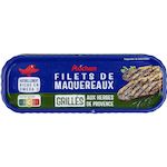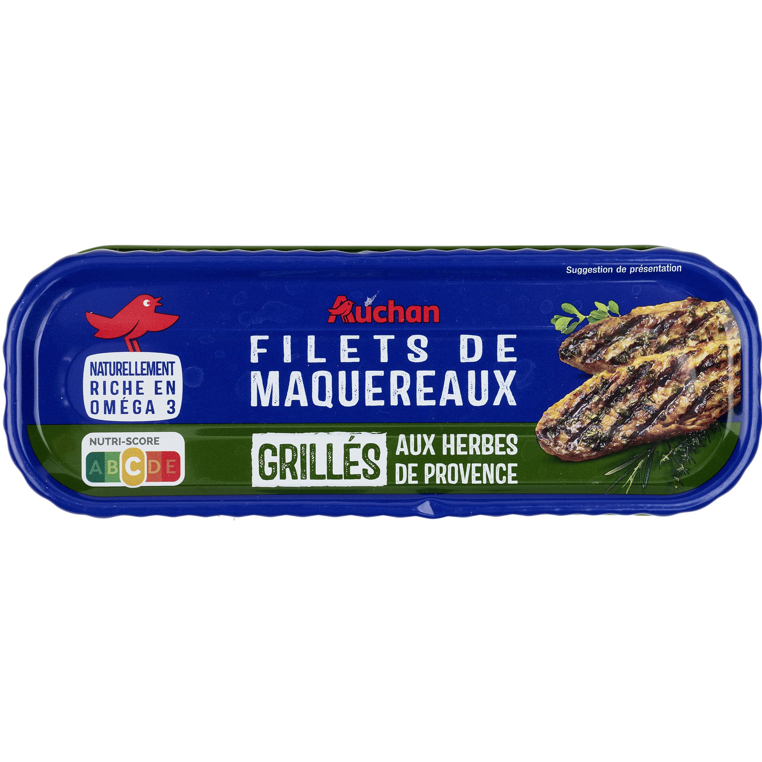Ingrédients : filets de maquereaux (POISSONS) 85% ( Scomber scombrus ), huile de tournesol, eau, herbes de Provence (basilic, origan, romarin, thym) 1.2%, sel, épaississant :gomme guar. Traceséventuelles de moutarde