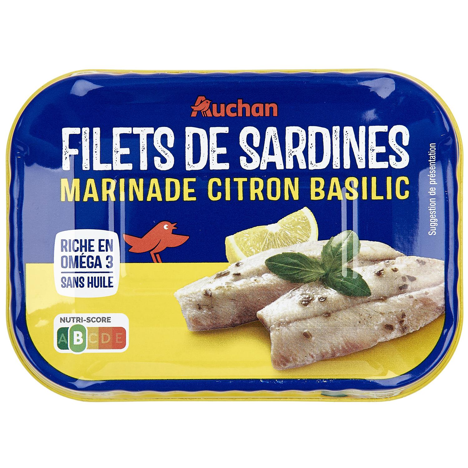 Ingrédients : Filets de sardines (POISSONS) ( Sardina pilchardus ) 80%, eau, vinaigres d'alcool , citron broyé 2,2% , sel, sucre, arôme naturel de citron, épaississant : gomme guar, basilic déshydraté 0,02% ,arôme naturel. Zone de pêche des sardines :Océan Atlantique Centre-Est