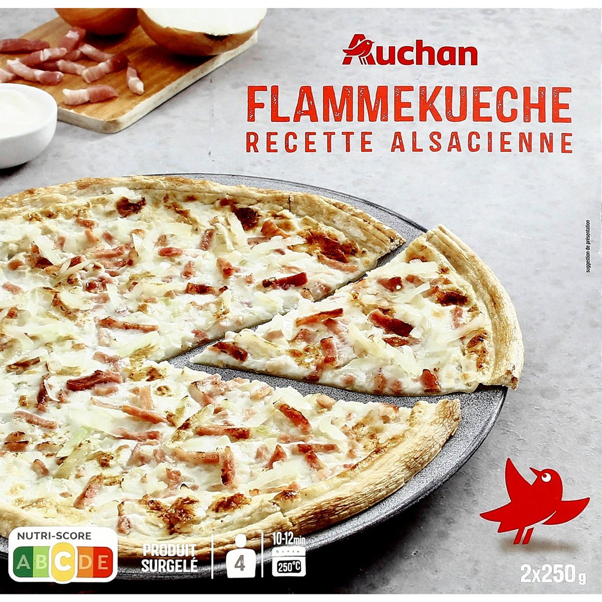 Ingrédients : Farine de BLÉ, eau, fromage blanc (LAIT) 15%, crème fraîche (LAIT)15%, lardons crus fumés 12% (poitrine de porc, sel, dextrose, épices, arôme de fumée, arômes naturels, antioxydant : ascorbate de sodium, conservateur : nitrite de sodium), oignons 10%, huile végétale de colza, LAIT entier en poudre, sel, amidon modifié, gélatine de porc, émulsifiant : mono- et diglycérides d'acides gras, poivre, farine de BLÉ malté, agent de traitement de la farine : L-cystéine. Traces éventuelles de crustacé, œuf, poisson, soja, céleri, fruits à coque, moutarde, sésame, mollusque. Élaboré à partir de lait et de viande origine UE.