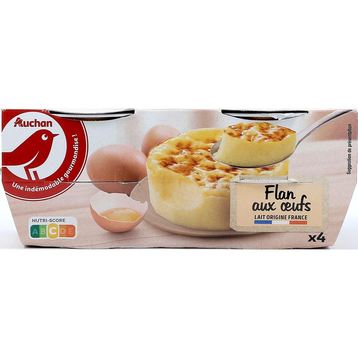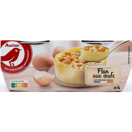 Ingrédients : LAIT entier 67.9%, ŒUFS entiers 18.3%, sucre 11.1 %, amidon modifié de maïs, arôme gout vanille, LAIT écrémé en poudre, gélifiant : carraghénanes, épaississant : farine de graines de caroube colorant : béta-carotène. Traces éventuelles de blé. Elaboré à partir de lait origine France.