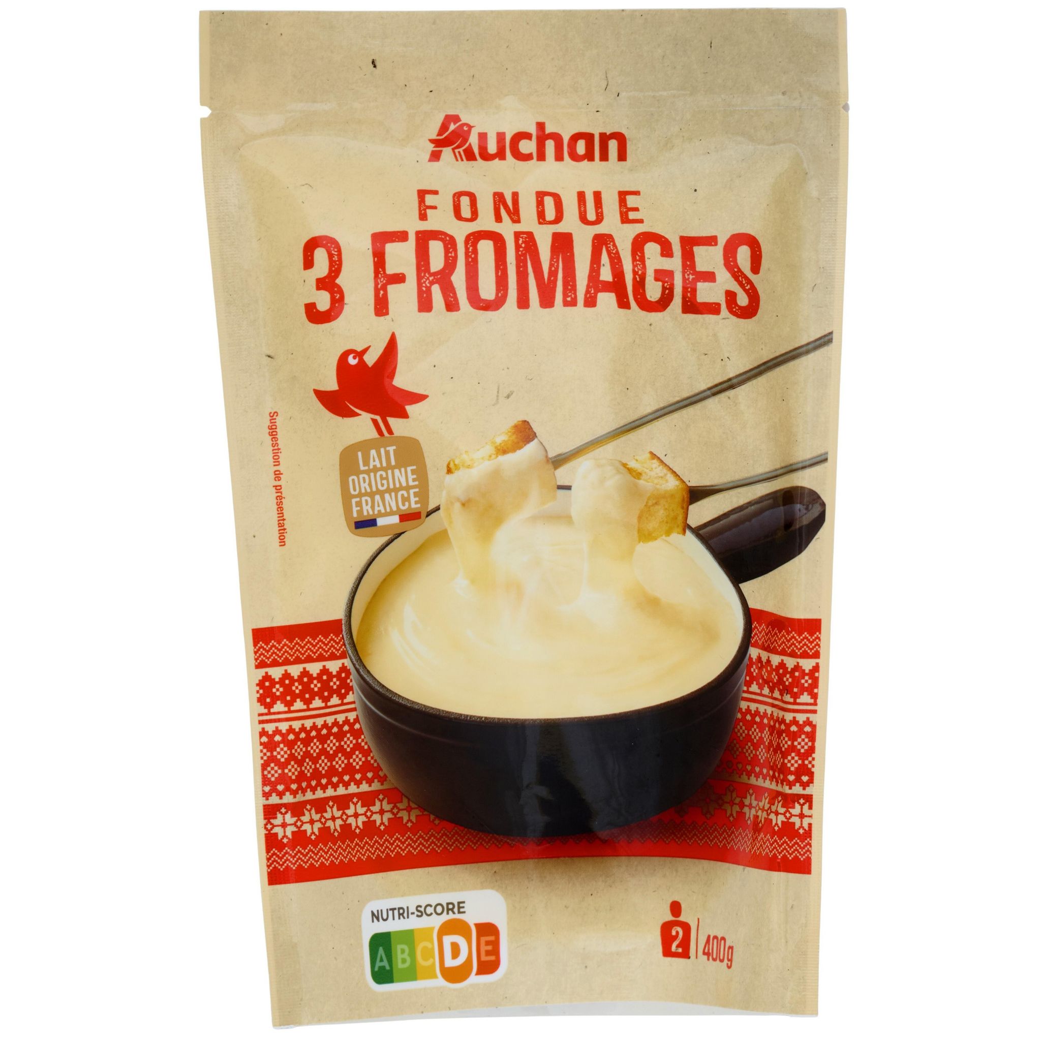 Ingrédients : Emmental 36% (LAIT), eau, vin blanc 18% (raisins, mout concentré rectifié, conservateurs : ANHYDRIDE SULFUREUX, DISULFITE de potassium, SULFITE acide de potassium correcteurs d’acidité : acide malique, acide tartrique), Tomme 7% (LAIT), crème (LAIT), Comté 3% (LAIT), amidon modifié de maïs, sel, ail déshydraté, boisson spiritueuse au kirsch. Teneur en alcool : 1,5%. L'abus d'alcool est dangereux pour la santé. Fromages et crème issus de lait origine France.