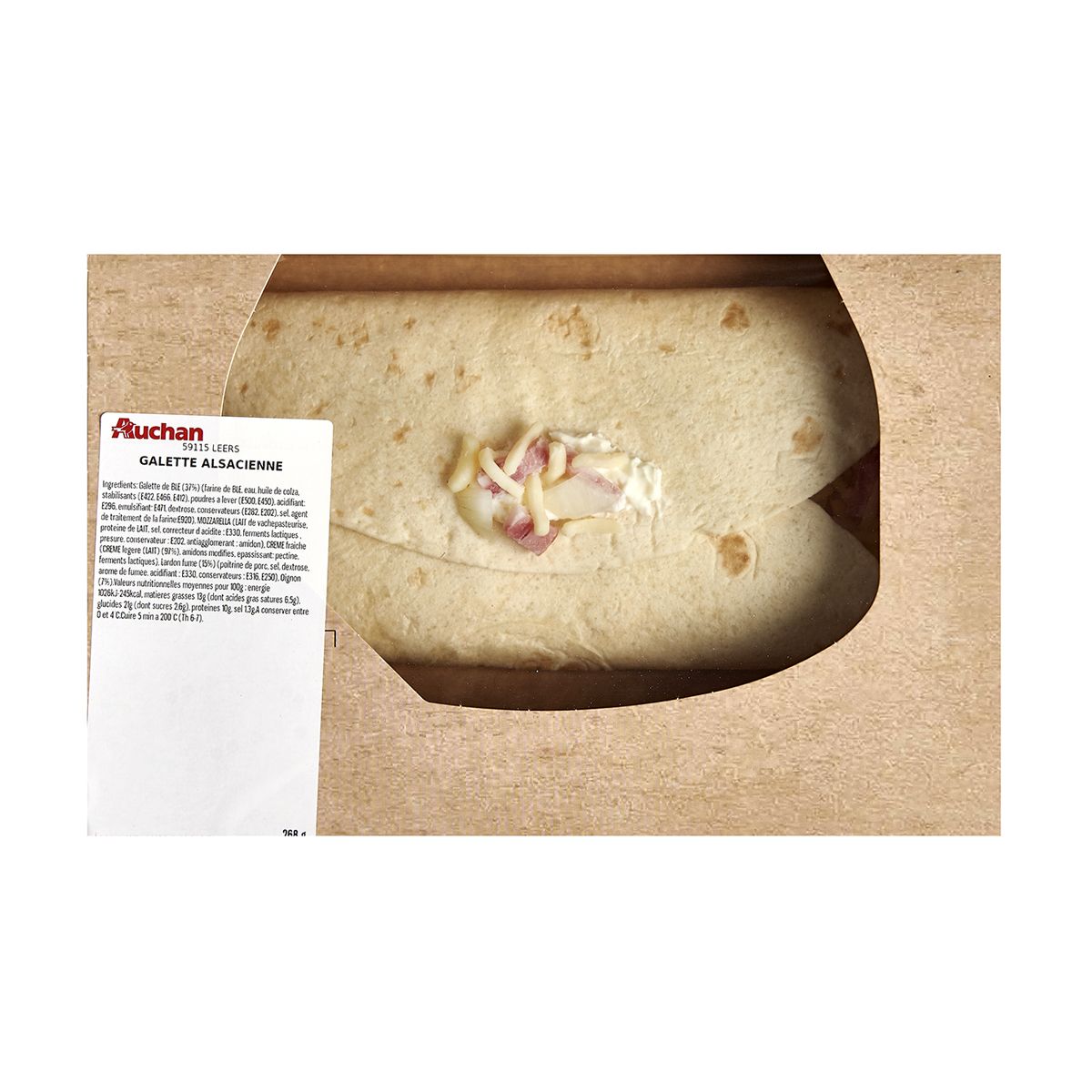 galette de farine de blé 36,6% (farine de BLÉ 65%, eau, huile de colza, stabilisants : E422, E412, E466, poudres à lever: E450, E500, acidifiant: E296, émulsifiant: E471, dextrose, conservateurs: E202, E282, sel, agent de traitement de la farine: E920), mozzarella râpée (LAIT de vache pasteurisé (origine UE), protéines de LAIT, sel, correcteur d'acidité : E330, ferments LACTIQUES, coagulant microbien, conservateur : E202, anti agglomérant : amidon), Crème fraîche légère épaisse 18,7% (CRÈME légère pasteurisée (Origine France) (97%), amidon modifié, épaississant : E440, ferments LACTIQUES), lardon cuit fume 14,9% (poitrine de porc (Origine UE), sel, dextrose, arome de fumee, acidifiant : E330, antioxydant : E316, conservateur : E250), oignon 7,5%.