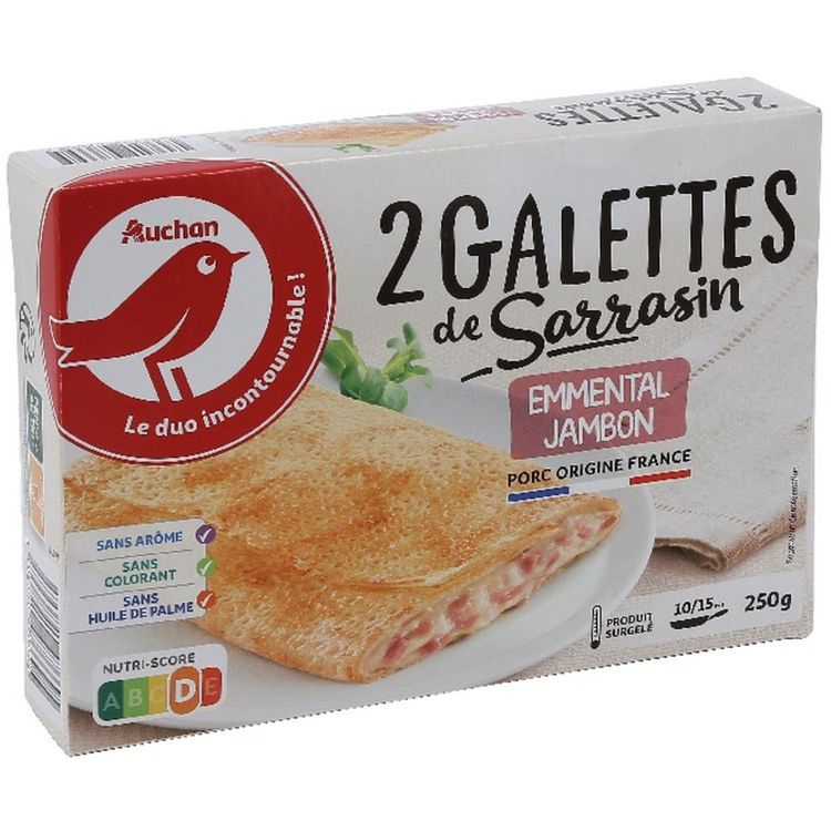 Garniture 60% : emmental 16,1% ( lait ), jambon cuit supérieur 14,2% (jambon de porc (origine : France), sel, sirop de glucose, dextrose, antioxydant : E301, conservateur : E250), crème fraîche ( lait ), lait , eau, farine de blé , amidon de riz, sel. Pâte 40% : eau, farine de blé , farine de Sarrazin, œufs frais, lait en poudre, huile de tournesol, sel. Pourcentages exprimés sur le total de la recette. Traces éventuelles de soja et de fruits à coque. Fabriqué avec du lait origine UE.