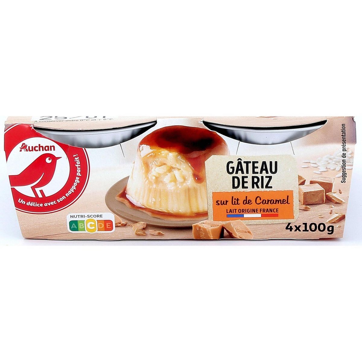 Ingrédients : LAIT entier 63.7%, sucre 10.5%, riz rond de Camargue 10.4%, OEUFS entiers 6.8%, caramel 6% (sucre, eau, amidon transformé de pomme de terre épaississants : pectine, gomme xanthane) crème (LAIT), arôme vanille, sel. Traces éventuelles de blé. Elaboré à partir de lait origine France.