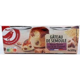 Ingrédients : LAIT entier 63.7% , sucre 11.8% , OEUF frais 7%, caramel 5,8% (sucre, eau amidon) semoule de BLÉ 5,6% , raisins macérés au rhum 5,2%, arôme Elaboré à partir de lait origine France.