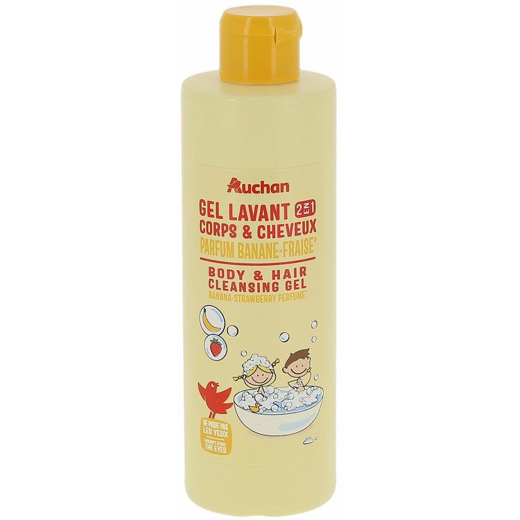 Plongez vos enfants dans un univers fruité avec le Gel Douche Lavant 2en1 Corps et Cheveux Auchan Kids, à la délicieuse association de banane et de fraise.Ne Pique Pas les Yeux Sa formule ne pique pas les yeux, pour un lavage sans larmes. Vos enfants peuvent ainsi profiter pleinement de leur moment de bain en toute sécurité, et sans larmes.Tolérance Optimale et Sécurité de nos formules Testé sous contrôle dermatologique et ophtalmologique, le Gel Douche Lavant 2en1 Corps et Cheveux Auchan Kids nettoie en douceur et vous garantit une composition sûre et un choix rigoureux des ingrédients. Scannez pour découvrir sa note sur votre application de notation favorite! Conseils d'utilisation Appliquez une petite quantité de shampoing sur les cheveux mouillés de vos enfants, faites mousser délicatement, puis rincez abondamment à l'eau tiède. Répétez l'opération si nécessaire.
