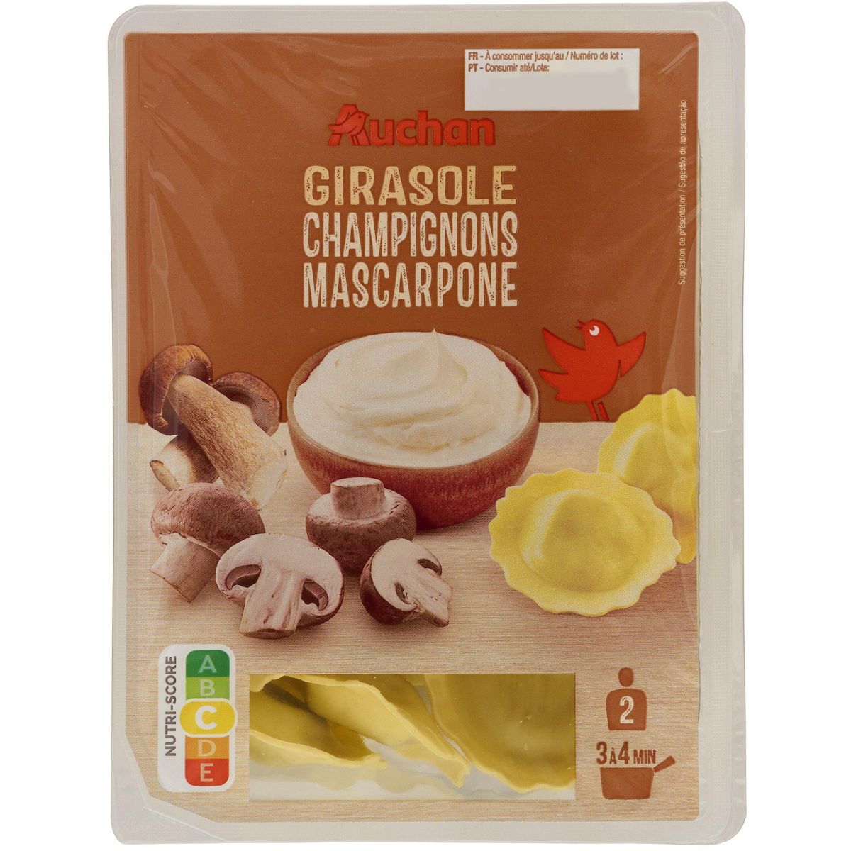 Ingrédients : SPAN STYLE=\"TEXT-DECORATION: UNDERLINE\" Farce 58% : SPAN STYLE=\"TEXT-DECORATION: UNDERLINE\" champignons de Paris ( Agaricus bisporus ) 14,5%, chapelure (farine de BLÉ tendre, eau, sel, levure), fromage mascarpone (LAIT) 11,1%, cèpes ( Boletus edulis , Boletus aereus , Boletus pinophilus , Boletus reticulatus ) 8,7%, sérum de LAIT en poudre, huile de tournesol, ricotta (sérum de LAIT, LAIT, crème (LAIT), sel) 1,1%, sel, persil, ail en poudre, poivre. Pâte 42% : farine de BLÉ tendre 24,1%, ŒUFS 8,4%, semoule de BLÉ dur 6%, eau. Traces éventuelles de crustacés, poissons, fruits à coque, céleri, soja, moutarde et mollusques. Pourcentages exprimés sur le total de la recette. Elaboré à partir de lait origine UE et non-UE.