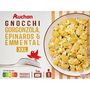 Ingrédients : Gnocchi 56% (semoule de BLÉ dur, pommes de terre deshydratée, eau, sel), crème (LAIT), eau, gorgonzola (LAIT) 5.5%, épinard 4,5%, emmental (LAIT) 2%, LAIT demi-écrémé, beurre (LAIT), amidon modifié, sel, huiles végétales (contient tournesol et/ou colza), épaississants: gomme xanthane, gomme guar, dextrose, protéine de LAIT, poudre de lactosérum (LAIT), extrait de poivre. Traces éventuelles de moutarde Elaboré à partir de lait d'origine UE.