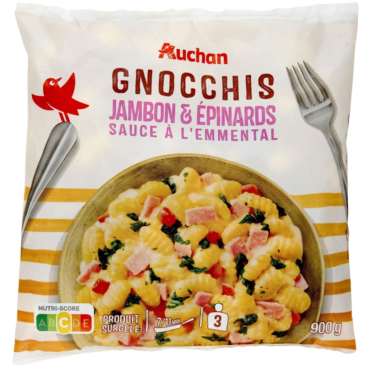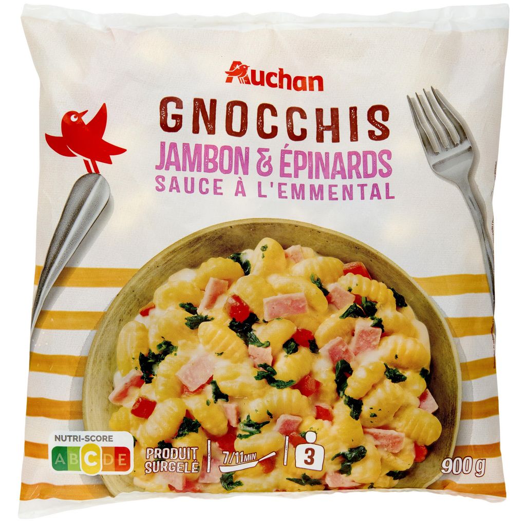 gnocchis à la pomme de terre accompagnés d'une sauce (25%) à l'emmental et de jambon supérieur, surgelés.