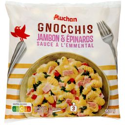 Ingrédients : gnocchi 41% (semoule de BLÉ dur, purée de pomme de terre 33% (eau, pomme de terre déshydratée), eau, sel), jambon cuit supérieur 12% (jambon de porc (origine France) 11,5%, sel, sirop de glucose, dextrose, arômes naturels conservateurs : ascorbate de sodium , nitrite de sodium), crème fraiche (LAIT) 10%, épinard 9%, tomate 8%, emmental (LAIT) 6,7%, eau, LAIT demi écrémé, amidon transformé, sel, huile de tournesol épaississants : gomme xanthane, gomme guar glucose, extrait de poivre. Elaboré à partir de lait origine UE. Traces éventuelles de moutarde.