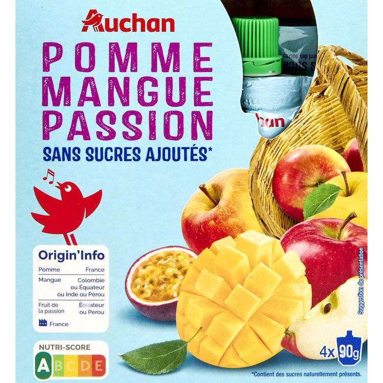 Ingrédients : purée de pommes 74.9% (origine France), purée de mangues 20% (origine Colombie et/ou Equateur et/ou Inde et/ou Pérou) , purée de fruits de la passion 5% (origine Equateur et/ou Pérou), antioxydant : acide ascorbique.