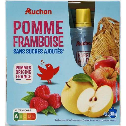 Ingrédients : Pomme 79,9% (origine France), framboise 20% (origine UE et/ou hors UE), antioxydant : acide ascorbique