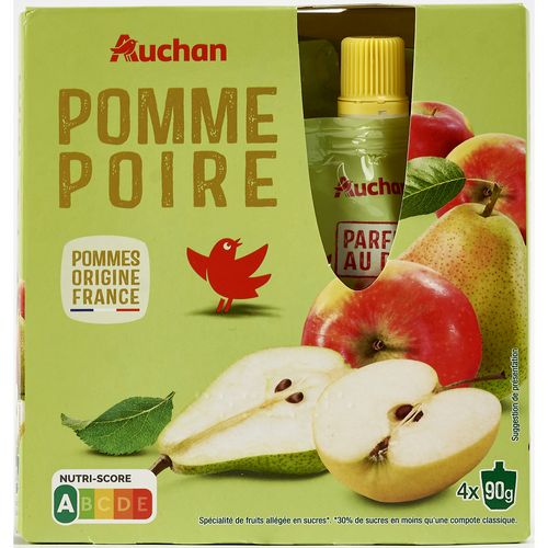 Ingrédients : Pomme 65,8% (origine France), poire 30% (origine France et/ou Italie et/ou Espagne), sucre, arôme naturel, jus de citron concentré (si nécessaire pour réguler l'acidité), antioxydant : acide ascorbique