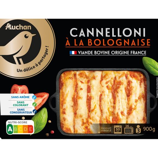 Pâtes précuites farcies à la viande bovine, garnies de béchamel, de sauce tomate et d'emmental, surgelées.