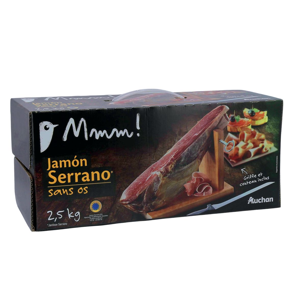 Véritable pièce de Jambon Serrano STG, origine Espagne. La griffe et le couteau sont offerts pour la réussite du tranchage de ce jambon SANS OS