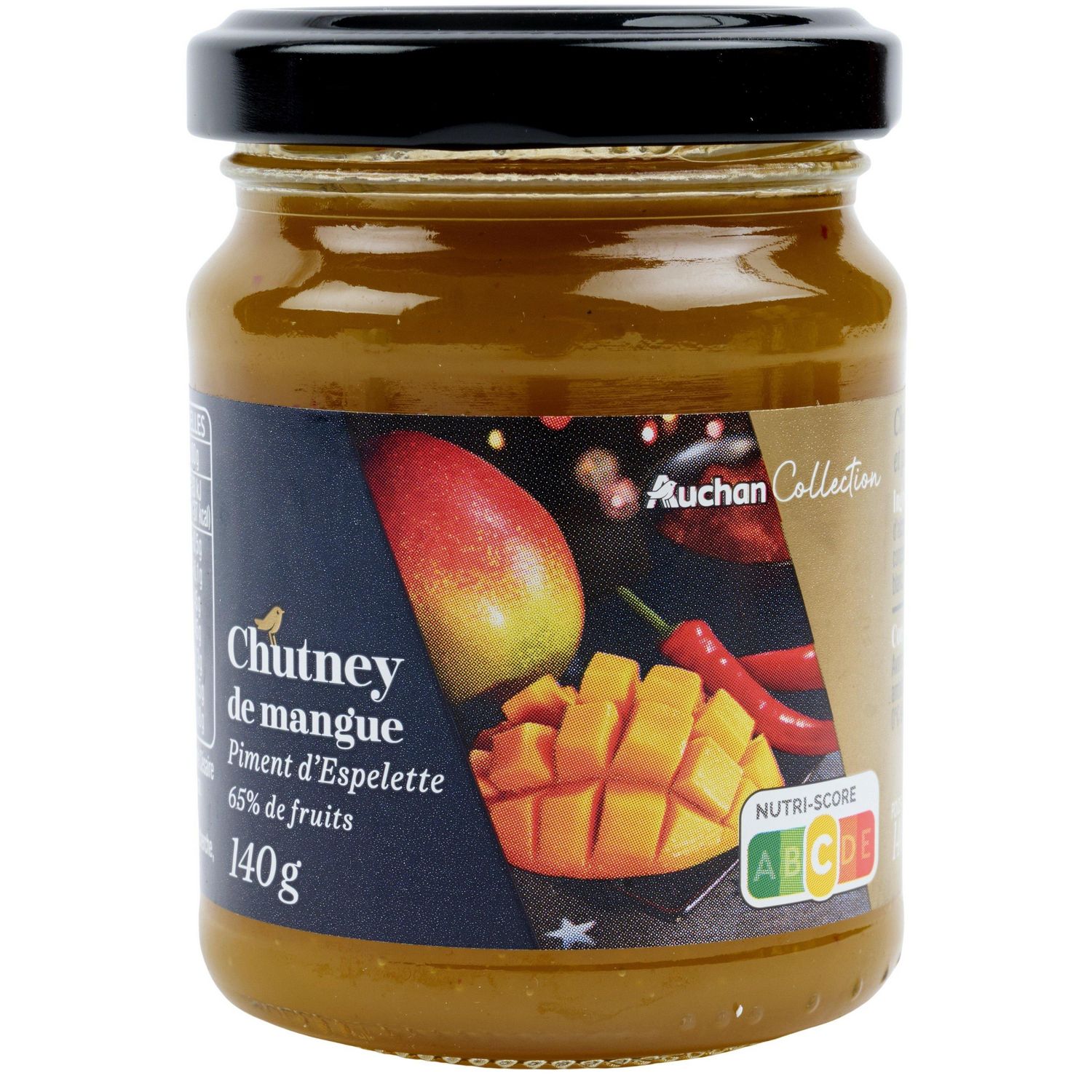 Ingrédients : Mangue 65%, sucre, vinaigre d'alcool, gélifiant : pectines, jus de citron concentré, sel, piment d'Espelette 0,04%, poivre blanc.