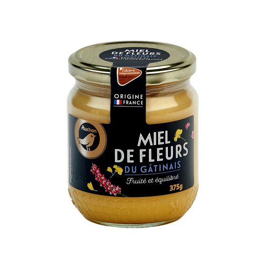 Miel de fleurs du Gâtinais fruité et équilibré Auchan Gourmet origine 100% France. Une filière responsable sur tous les plans : Environnemental : Les contrôles systématiques avant conditionnement assurent que le Miel Auchan ne contient pas de résidus de pesticides ni d'antibiotiques. Il n'