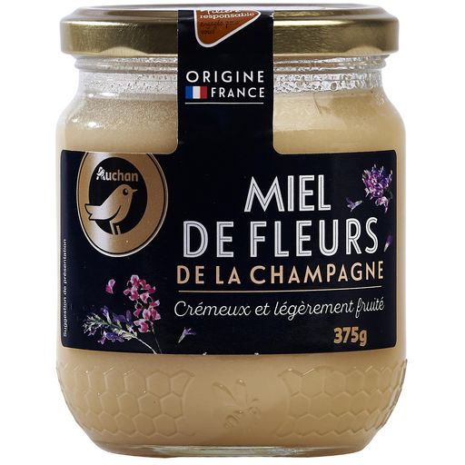 Miel de Fleurs de la Champagne Auchan Gourmet origine 100% France. Une filière responsable sur tous les plans : Environnemental : Les contrôles systématiques avant conditionnement assurent que le Miel Auchan Gourmet ne contient pas de résidus de pesticides ni d'antibiotiques. Il n'y a pas