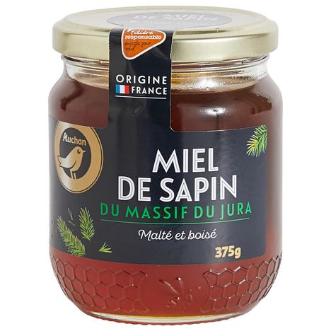 Miel de sapin Auchan Gourmet. du massif du Jura. Une filière responsable sur tous les plans : Environnemental : Les contrôles systématiques avant conditionnement assurent que le Miel Auchan Gourmet ne contient pas de résidus de pesticides ni d'antibiotiques. Il n'y a pas de traitement chimiqu