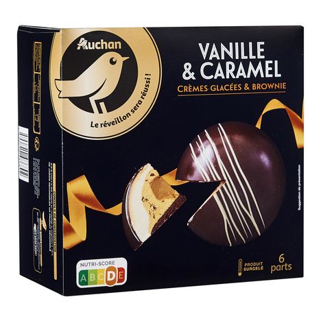 Dessert glacé composé d’une crème glacée à la vanille 46,4%, d’une crème glacée au caramel au beurre salé avec copeaux de chocolat 23,4%, d’un brownie au chocolat noir 13,4%, d’un fourrage au caramel 6,7% et d’un décor 10,1%, surgelé.