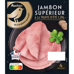 Jambon cuit de qualité supérieure, découenné et dégraissé, issu de Porc FRANCAIS. Jambon finement parfumé à la truffe d'été (1,30%)