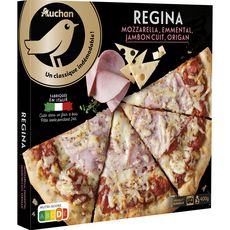 Farine de blé, pulpe de tomate, mozzarella 11,2% (lait, sel, ferments lactiques, coagulant microbien, correcteur d'acidité: acide citrique), emmental (lait) 10%, jambon cuit supérieur 9% (viande de porc, sel, sirop de glucose, dextrose, arômes naturels, antioxydant: ascorbate de sodium, conservateur: nitrite de sodium), eau, huile de tournesol, semoule de blé dur, purée de tomate, sel, huile d'olive vierge extra, sucre, origan 0,05%, farine de blé malté, levure, levure inactive (contient blé), enzymes (contient blé). Traces éventuelles de poisson, crustacés, oeuf, soja, fruits à coque, céleri, moutarde, sésame, mollusques. Élaboré à partir de porc origine France.Le blé,la mozzarella, l'emmental, le jambon et l'origan ne proviennent pas d'Italie.