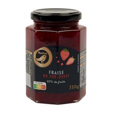 Ingrédients : Fraises 60%, sucre, gélifiant : pectine de fruits, jus de citron concentré. Préparée avec 60g de fruits pour 100g.