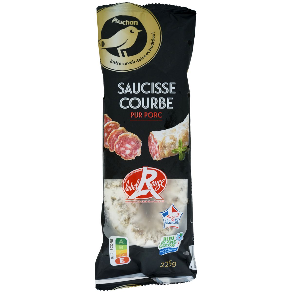 Découvrez la saucisse courbe Auchan. Un saucisson sec fabriqué avec du porc français et certifié Label Rouge, gage de la qualité supérieure de ce produit.