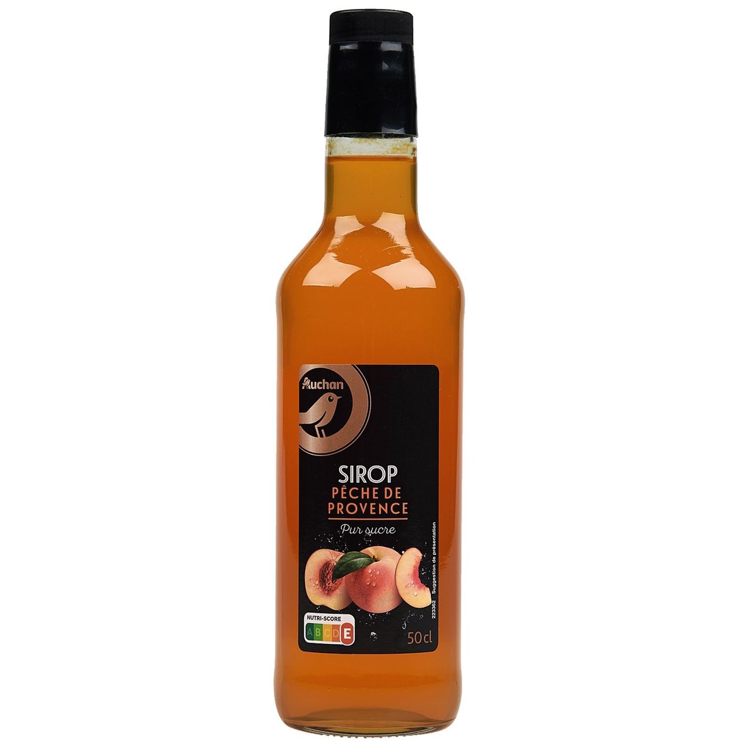 Sucre, eau, jus de pêche de Provence à base de concentré 10%, acidifiant : acide citrique, arômes naturels, colorants : bêta carotène, anthocyanes, stabilisant : esters glycériques de résine de bois.