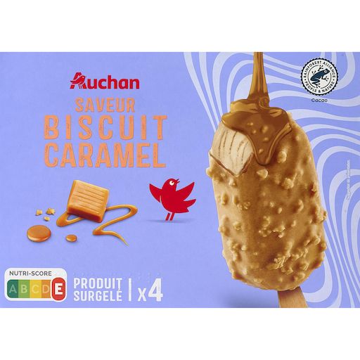 Ingrédients : Enrobage au chocolat blanc 28,9% (sucre, beurre de cacao*, poudre de lactosérum (LAIT), matière grasse laitière anhydre (LAIT), poudre de LAIT écrémé émulsifiants : lécithines de SOJA, polyricinoléate de polyglycérol arôme naturel de vanille), LAIT écrémé réhydraté, eau, sirop de glucose, sucre, graisse végétale de coprah, morceaux de biscuits 3,6% (farine de BLÉ, sucre, huile de tournesol, poudre de LAIT écrémé poudres à lever : carbonates d'ammonium, carbonates de sodium sel, gousses de vanille en poudre), poudre de lactosérum doux (LAIT), caramel au beurre salé (LAIT) 0,7% (sirop de glucose, LAIT entier concentré sucré, beurre salé (beurre (LAIT), sel) 0,1%, eau, sucre, sel), caramel aromatique 0,5% (sucre, eau) émulsifiant : mono- et diglycérides d'acides gras gélifiants : gomme guar, farine de graines de caroube, pectines arômes naturels, sel. Traces éventuelles d'autres céréales contenant du gluten (avoine, orge), d'arachides, d’œufs et de fruits à coque.Elaboré à partir de lait origine UE et hors UE.*Certifié Rainforest Alliance. Pour en savoir plus, rendez-vous sur ra.org.