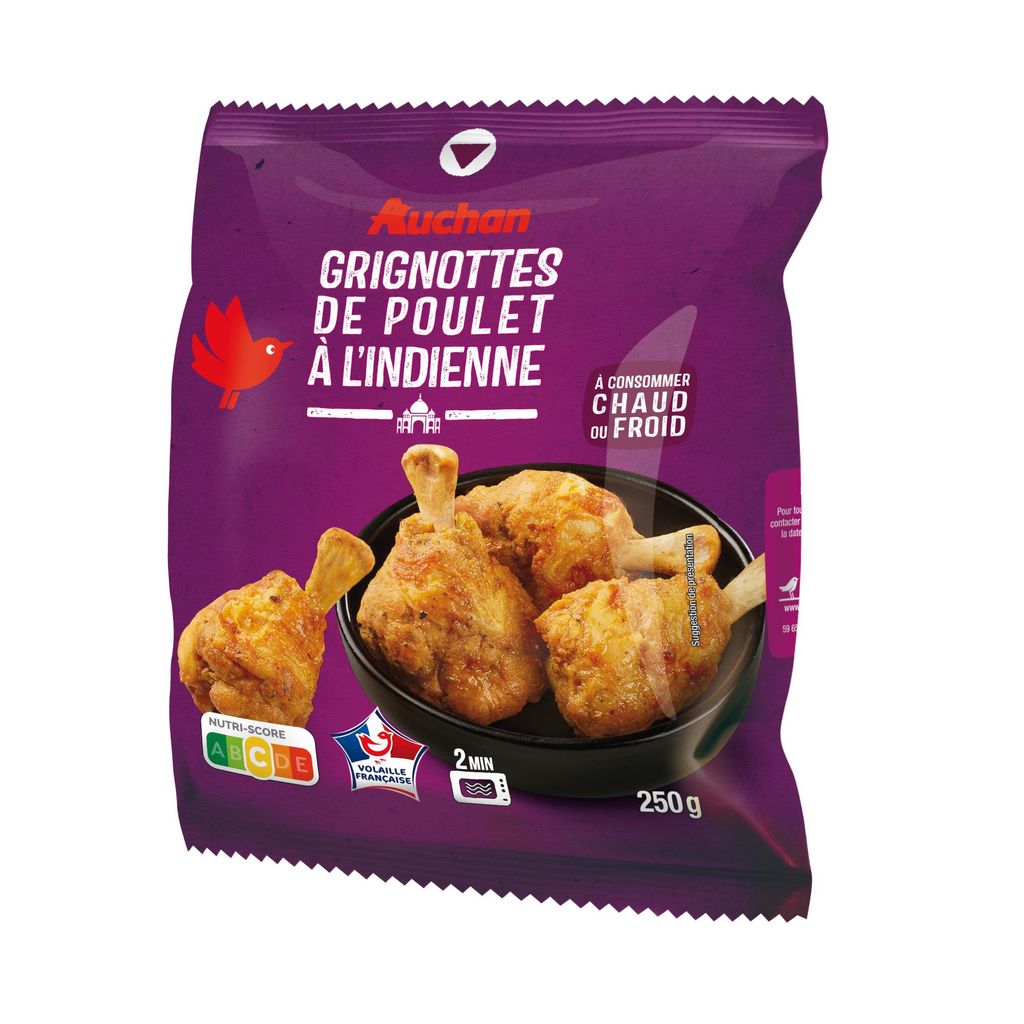 Ingrédients : Manchons de poulet (origine : France) 76%, eau, fibres et proteines de pois, epices et plantes aromatiques, semoule de riz, sel, sucre, amidon modifie, aromes naturels, huile de tournesol, ferments. Traces eventuelles de GLUTEN, de LAIT et d''OEUF.