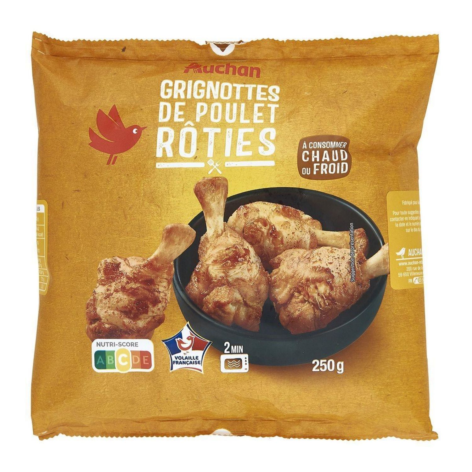 Ingrédients : Ingredients : Manchons de poulet (origine : France) 84%, eau, fibres et proteines de pois, aromes naturels, dextrose, extrait de poulet, sel, sucre, graisse de poulet, epices et plantes aromatiques, ferments. Traces eventuelles de GLUTEN, de LAIT et d''OEUF.
