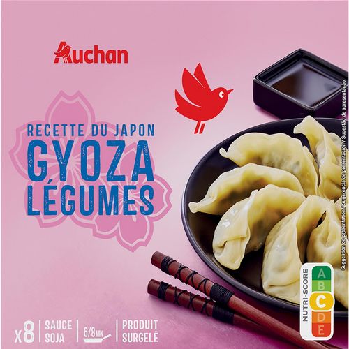 Ingrédients : Gyoza aux légumes: uFarce /u(60%) : chou de pékin 19,8%, préparation à base de radis blanc 12,9%, (radis blanc, farine de maïs, amidon de BLÉ et amidon modifié de tapioca, farine de BLÉ, huile de SOJA), ciboule de chine 8,1%, carotte 7,2%, échalote 3,6%, sauce SOJA (eau, graine de SOJA, BLÉ, sel, alcool), sucre, oignon 1,2%, huile de SÉSAME, huile de SOJA, gingembre, extrait de légume en poudre (oignon, sel, chou, ciboule, maltodextrine, carotte), sel, ail frit (ail, huile de SOJA), poivre blanc. uPâte de blé /u(40%) : mélange de farine 27,4% (farine de BLÉ, farine de tapioca, amidon transformé de tapioca), eau, huile de SOJA BRBRPourcentages exprimés sur les gyoza aux légumes. uSachet de sauce soja /u: vinaigre, eau, sucre, graine de SOJA, BLÉ, sel, extrait de légume en poudre (oignon, sel, chou, ciboule, maltodextrine, carotte). Traces éventuelles de crustacés, œuf, poisson, lait, cèleri, moutarde et de mollusque.