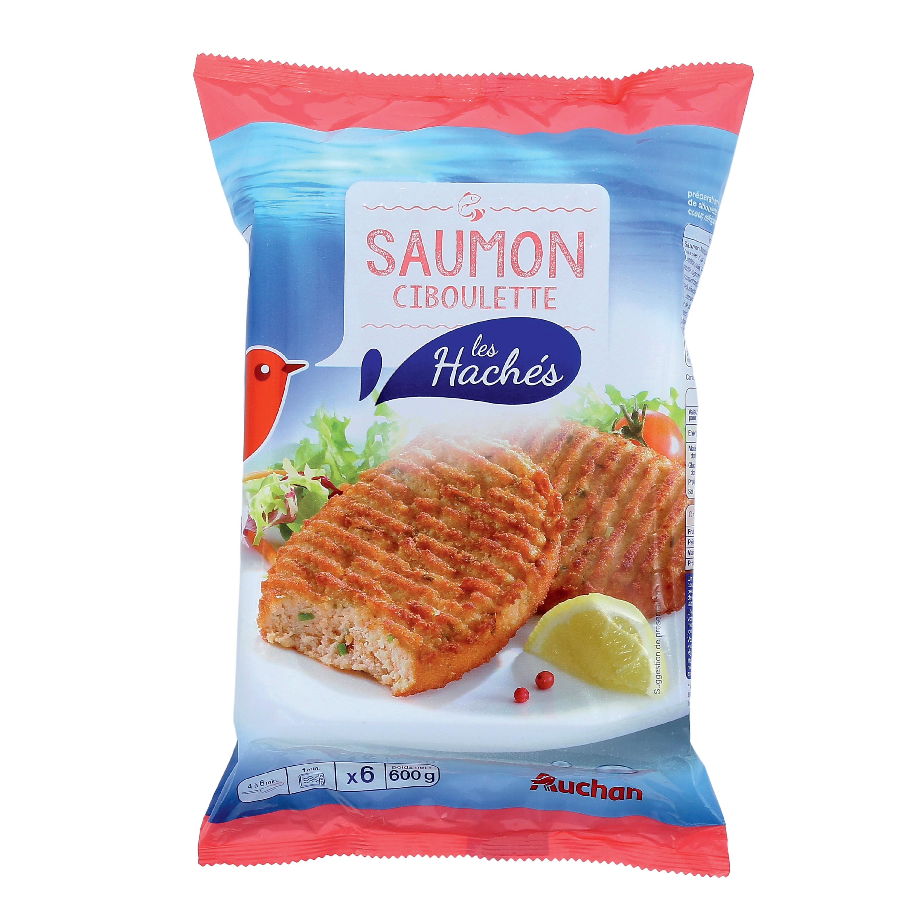 Ingrédients : Saumon Atlantique ( poisson ) 81%, huiles végétales (tournesol, colza), oignons préfrits (oignons, huile de tournesol), flocons de pomme de terre, eau, protéines de blé texturées déshydratées 2%(protéines de blé , farine de blé ), tomate double concentré, échalotes, ciboulette, blanc d' œuf en poudre, sel, poivre noir. Traces éventuelles de crustacés, soja, céleri, moutarde, mollusques, lait