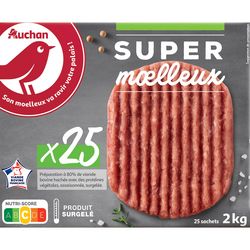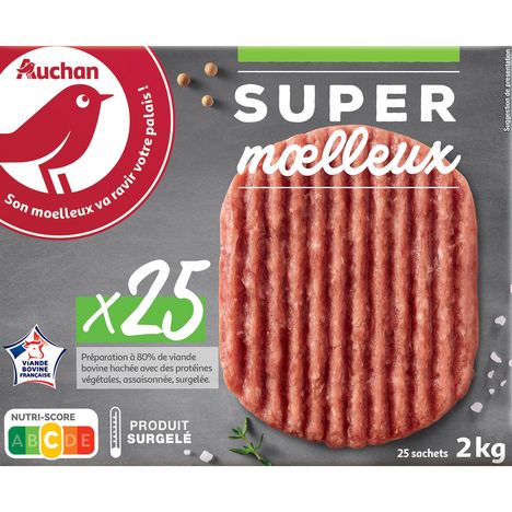 Ingrédients : Viande bovine hachée 80% (origine France), eau, protéines de soja 2,4%, farine de riz, arôme, sel, amidon de pomme de terre, fibre de pomme de terre, dextrose, huile de tournesol et/ou colza. Pourcentages exprimés sur le total de la recette.Traces éventuelles de céréales contenant du gluten (blé, avoine, épeautre, kamut, orge, seigle)Elaboré en France.