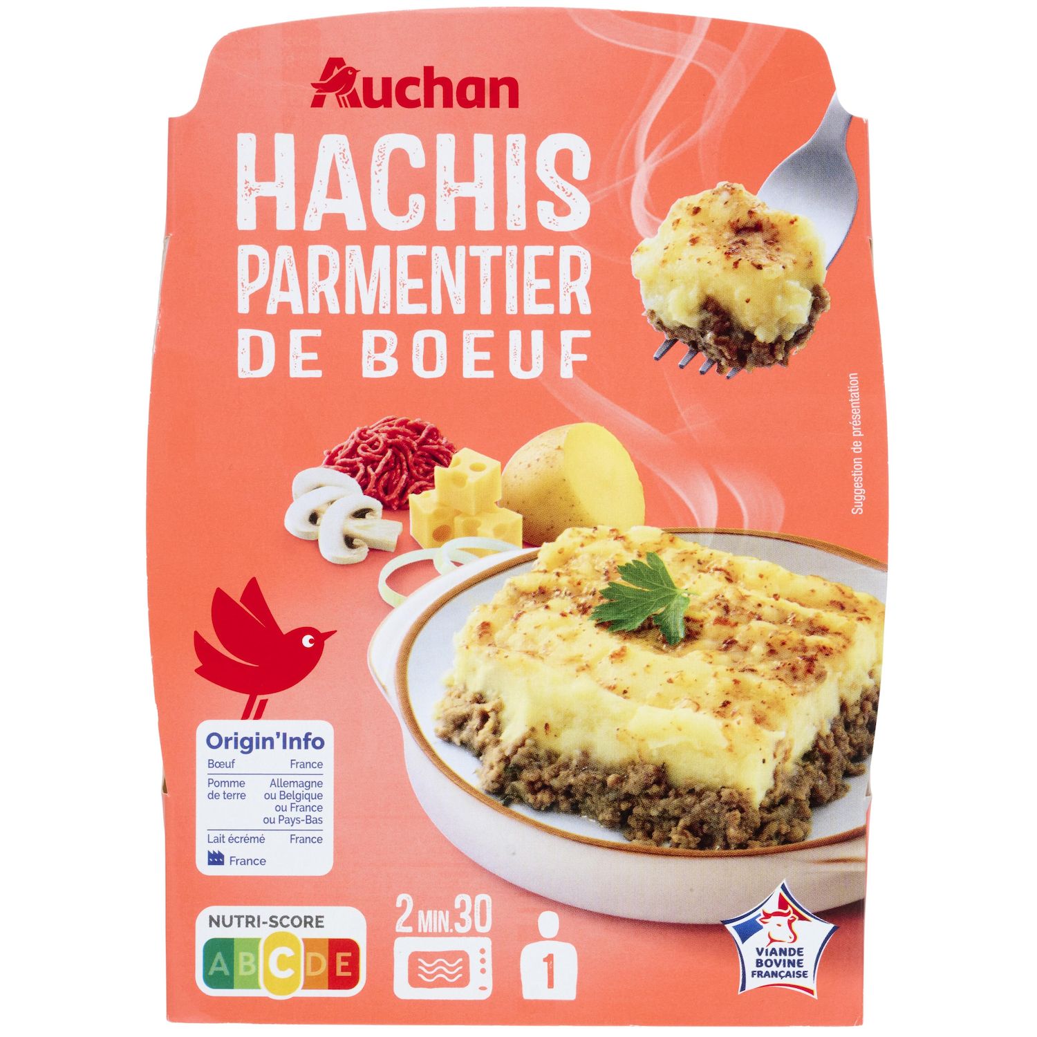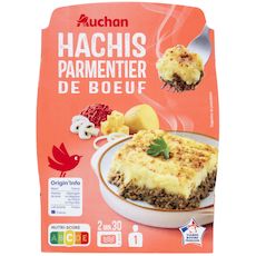 Ingrédients : LAIT écrémé réhydraté (eau, poudre de LAIT écrémé), viande de boeuf 17%, flocons de pommes de terre 9.9% (pommes de terre déshydratées, extrait d'épices, émulsifiant : mono et diglycérides d'acides gras), eau, champignons 6,4% (champignons de Paris, eau, sel), emmental 5.3% (LAIT), oignons, crème fraîche 4.5% (LAIT), crème de riz (eau, riz), beurre (LAIT), oignons frits (oignons, huile de tournesol), sel, persil 0.3%, champignons en poudre, huile de colza, poivre.Elaboré à partir de boeuf origine France.