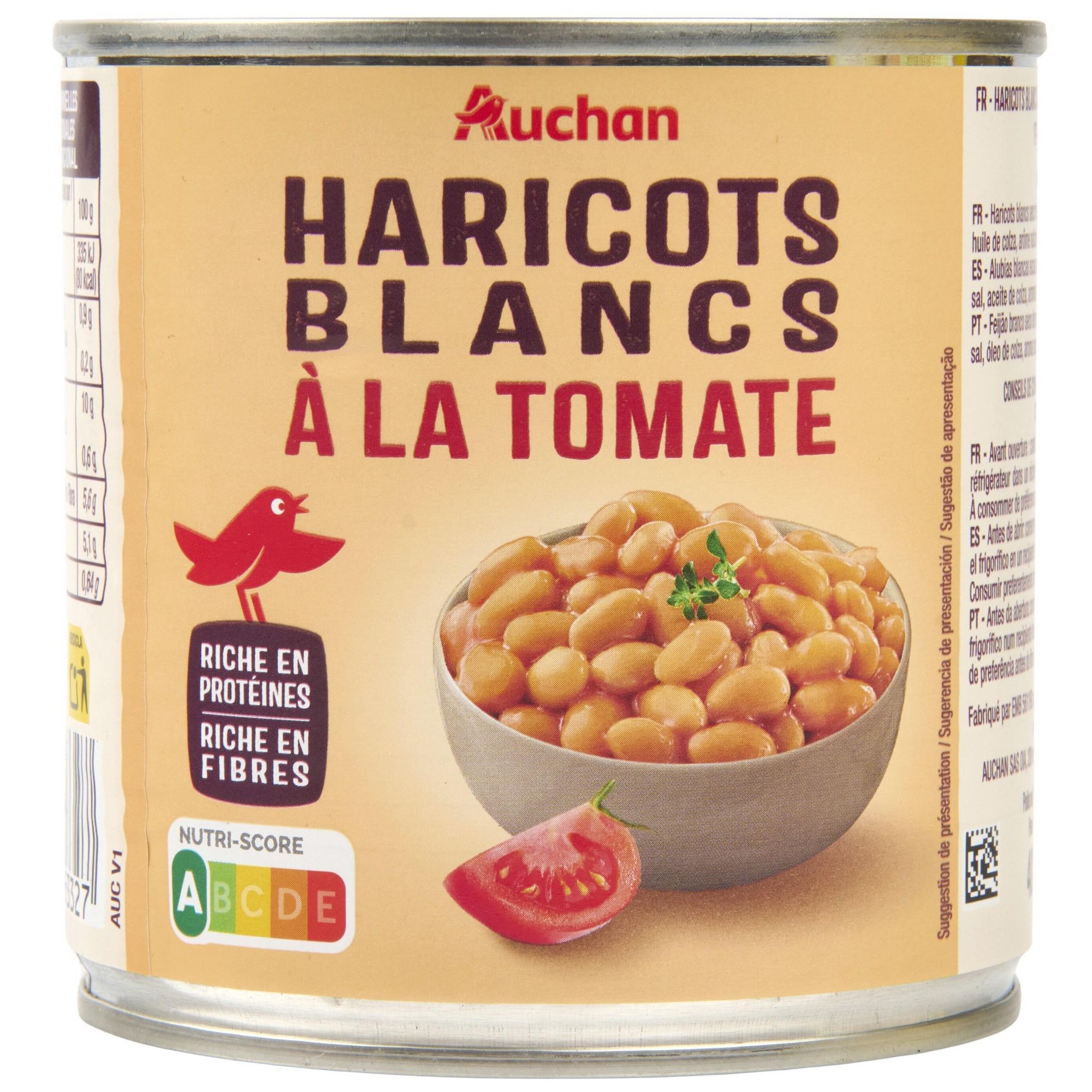Ingrédients : Haricots blancs secs trempés (50%), eau, double concentré detomates (2%), sel, huile de colza, arôme naturel.