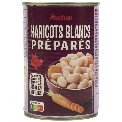 Ingrédients : Eau, haricots blancs trempés 43%, carottes 2%, sel, arômes naturels. Traces éventuelles de céréales contenant du gluten. Elaboré à partir de haricots blancs et de carottes origine France