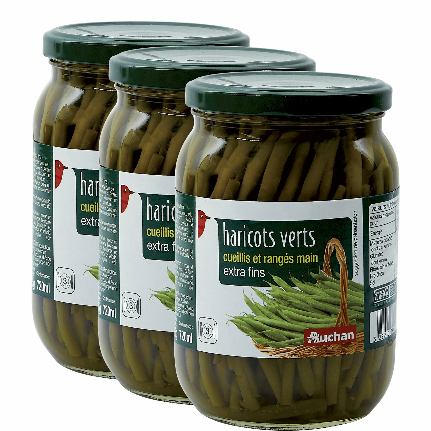 AUCHAN HARICOTS VERTS EXTRAFINS CUEIL RANG MAIN 3X345G