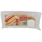 Ingrédients : Garniture 51,7%: saucisse de Strasbourg 29,2% [viande de porc (origine France) 21,3%, eau, plasma de porc, gras de porc (origine France),sel, dextrose, lactose (LAIT origine UE), protéines de LAIT (LAIT origine UE et Royaume-Uni), arômes, antioxydant :ascorbate de sodium, colorant : extrait de paprika, conservateur :nitrite de sodium], emmental 12,5% (LAIT origine UE), sauce ketchup 10% (purée de tomates concentrée, eau, vinaigre d'alcool, sucre, amidon de maïs, sel, épices). Pain spécial* 48,3% : farine de BLÉ, eau, sucre, huile de colza, levure, sel, GLUTEN de BLÉ, conservateur : propionate de calcium, farine de fève, extrait d'acérola. Pourcentages exprimés sur le total de la recette. Traces éventuelles de graines de sésame, moutarde, œufs, poissons et autres céréales contenant du gluten. *Mise en œuvre d’ingrédients décongelés, ne pas recongeler.