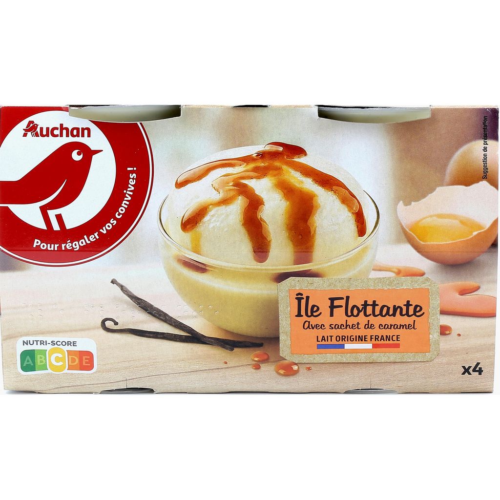 Ingrédients : Ile flottante 95% :LAIT partiellement écrémé, blanc D'OEUFS frais 16%, sucre , jaune d'OEUFS frais 6.18% ,amidons transformés de pomme de terre , arôme naturel de vanille 0,6% , stabilisant : gomme xanthane, gousses de vanille épuisées 0.02%. Caramel aromatique 5% : sucre ,sirop de glucose-fructose ,eau. Elaboré en France à partir de lait origine: France