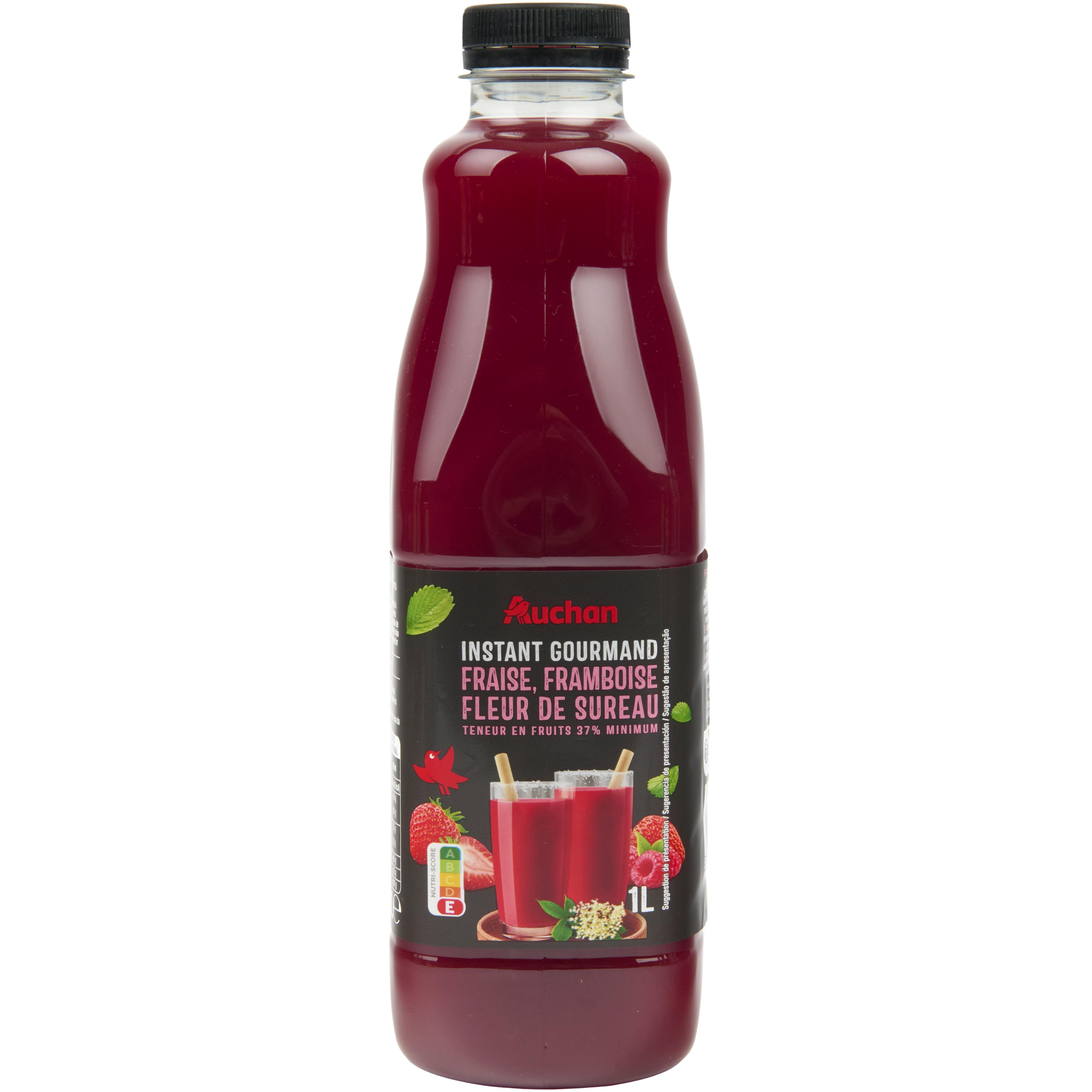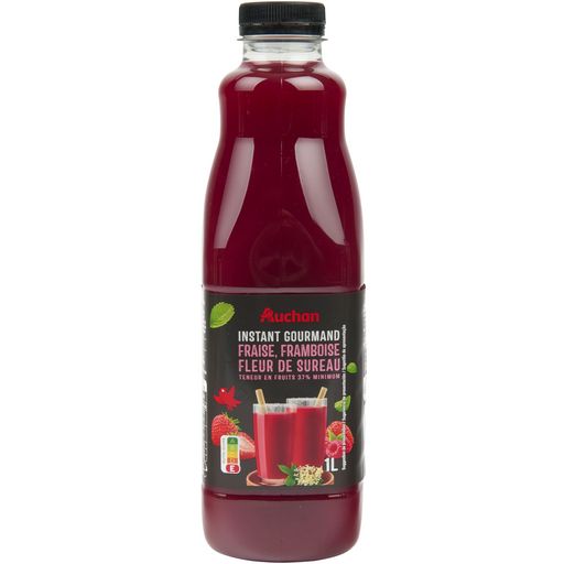 Ingrédients : Eau, purées de fruits et jus de fruits à base de concentrés: purée de fraise 11%, purée de pomme 10%, purée de framboise 7%, jus de cassis à base de concentré 6%, jus de citron à base de concentré 3%, sucre, arôme naturel de fleur de sureau, arôme naturel.