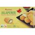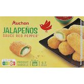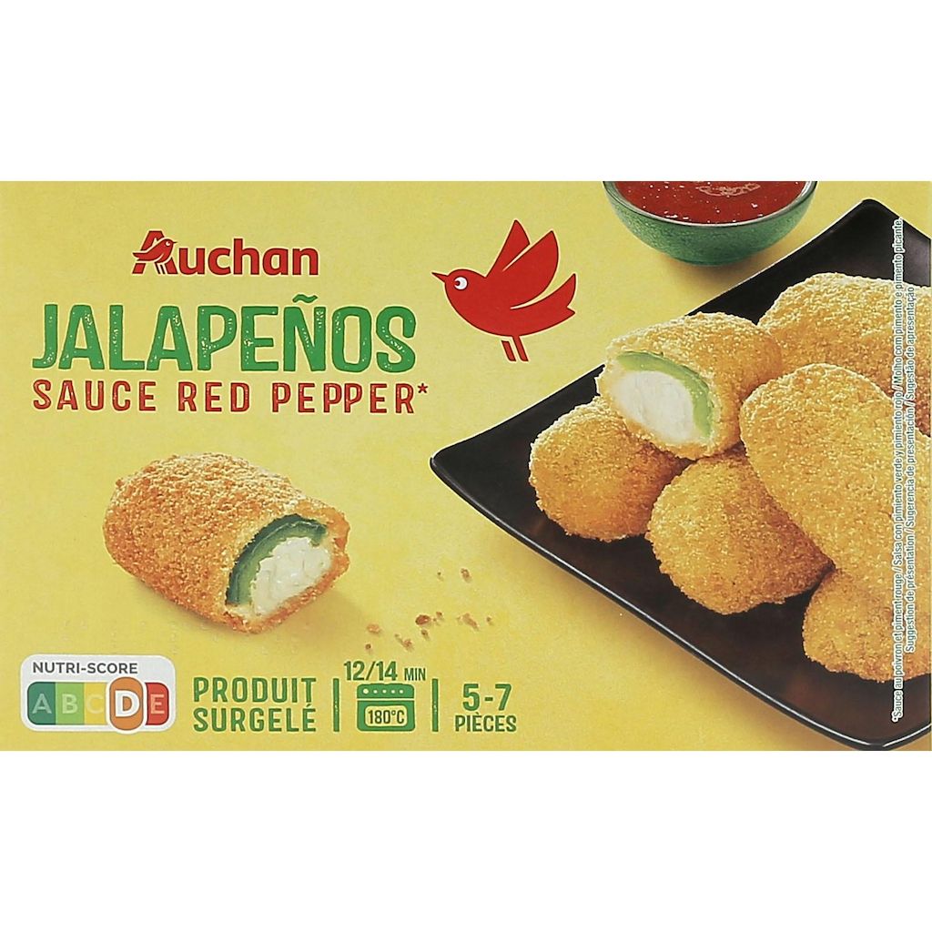Ingrédients : Jalapeños : Farine de BLÉ, fromage frais (LAIT) 20%, piment jalapenos marinés 17.6% (piment jalapenos 17.4%, eau, sel, acidifiant : acide acétique, agent affermissant : chlorure de calcium), huile de colza, eau, crème liquide [crème (LAIT), stabilisant : carraghénanes], farine de maïs, OEUF entier en poudre, sel, caseinate de sodium (LAIT), poudre à lever : carbonates de sodium, fécule de pomme de terre, amidon transformé de pomme de terre, levure, paprika, curcuma, acidifiant : acide citrique, extrait d'ail, extrait d’oignon.Sauce au poivron et piment : sucre, eau, poivron 0,5%, piment rouge 0,5%, amidon de maïs modifié, vinaigre d'alcool, jus concentré de pommes, sel, acidifiant: acide citrique.Pourcentages exprimés sur le contenu de la boite.Trace éventuelles de céleri et moutarde.